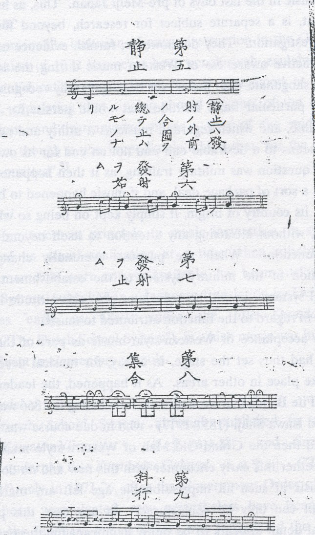 The first appearance in Japan of five line staff notation, trumpet music, and the influence of British military music, was the trumpet calls in Eikoku hohei renpō, (“English Infantry Drill Method”) of 1865.