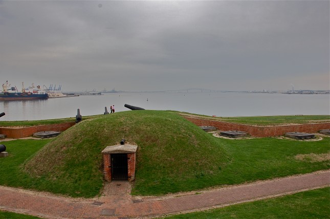 Ravelin guarding the entrance to Ft. McHenry, Francis Scott Key Bridge on the horizon, (photo by R.E.)