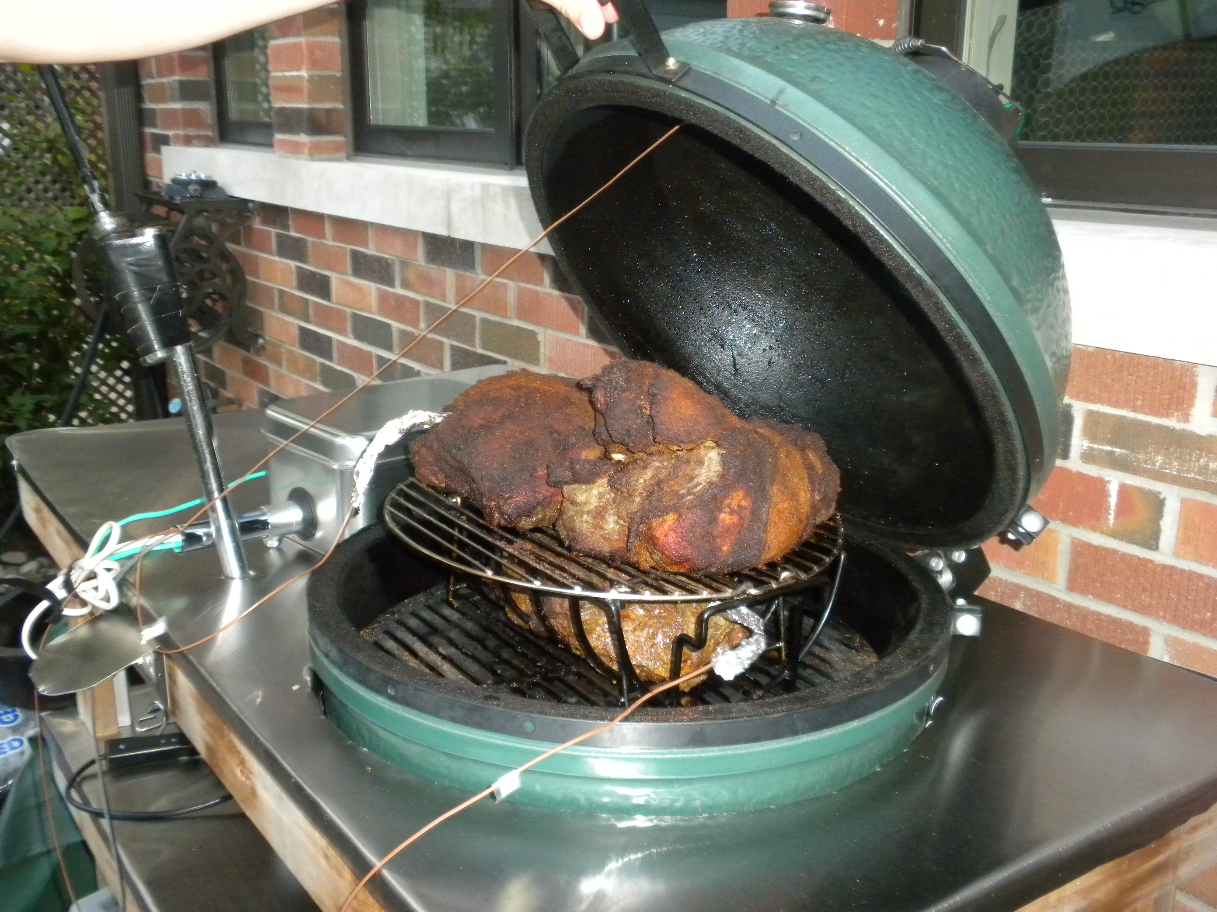First Bryce purchased a Stoker. The Stoker controls the Egg’s internal temperature by pumping air into the vents of the Egg. The more air, the higher the temperature. The Stoker measures the internal temperature of the Egg and sends a signal back to the control unit in the stoker which then signals the fan to increase or decrease its speed. There are also probes that measure the internal temperature of the meat.