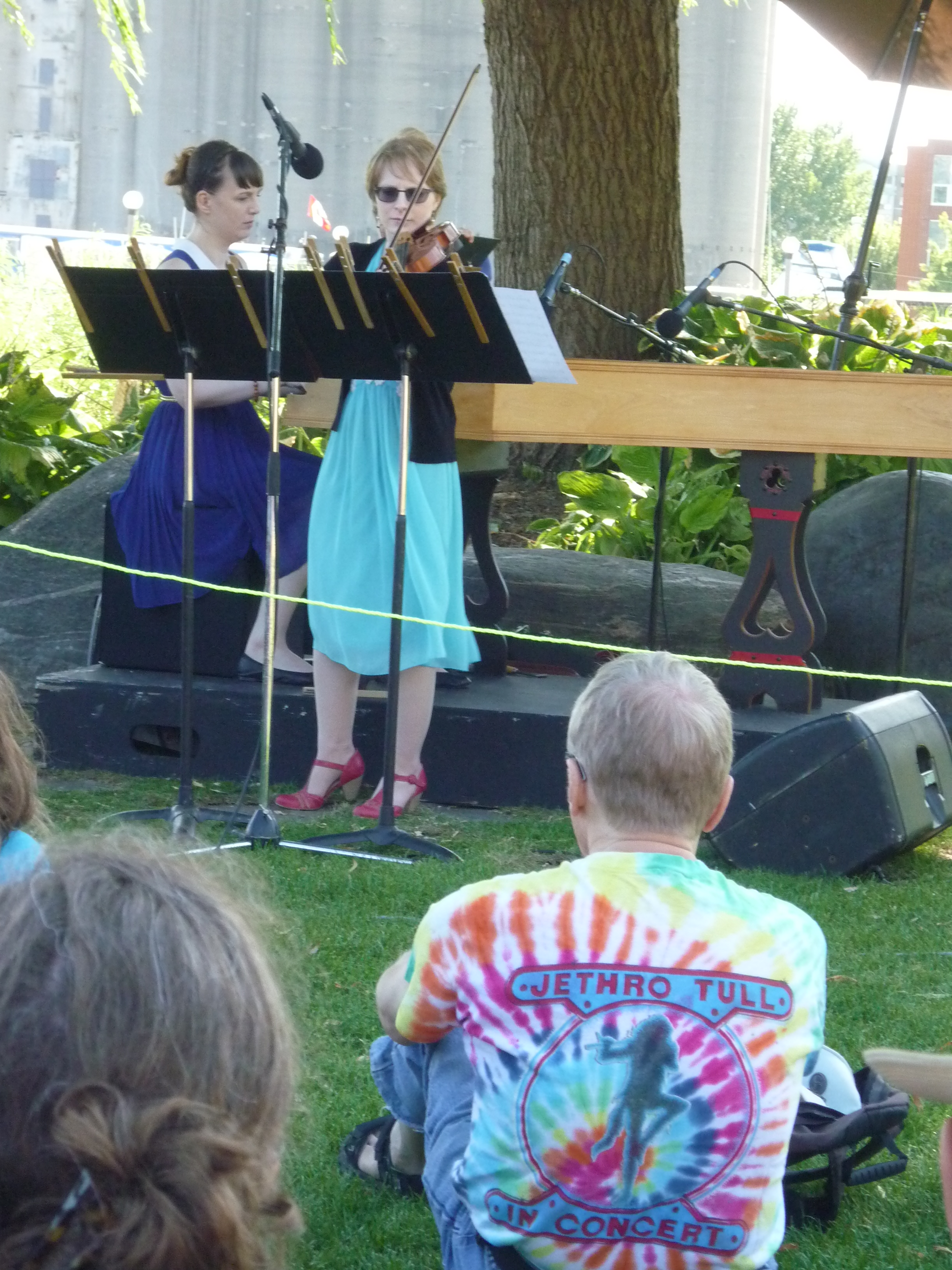 So what does all this extraneous noise portend for a harpsichord violin duo? Surprisingly little. The Music Garden has found a good sound-man who enhances instruments and keeps the music clearly audible against the ambient sounds. The violin harpsichord duo is from Montreal and though young, they have some very impressive things going for them. Les Amusement de la Chambres play a very interesting repertoire, mostly from the Baroque era, and play at an extremely high level of artistry. A commissioning program which regularly supplies them with contemporary works was responsible for Ms Smith’s work.