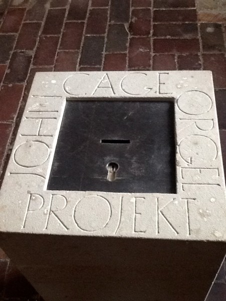 1,000 Euros will allow a donor to have a message inscribed on a metal plaque which will be mounted below a year of their choice if available. The church guardian, a Polish man who came to Halberstadt some years ago and found himself unemployed, vetted a number of job advertisements and chose the ORGAN2/ASLAP job because “it sounded interesting”. He is a delightful individual who loves the project under his care and has an understanding of Cage and his music that took me back a few paces. He knew the contents of the books for sale and was happy to answer questions. He said there were line ups on the weekends and a rather steady, but smaller flow on weekdays. When a change of notes takes place, St. Burchardi is packed.