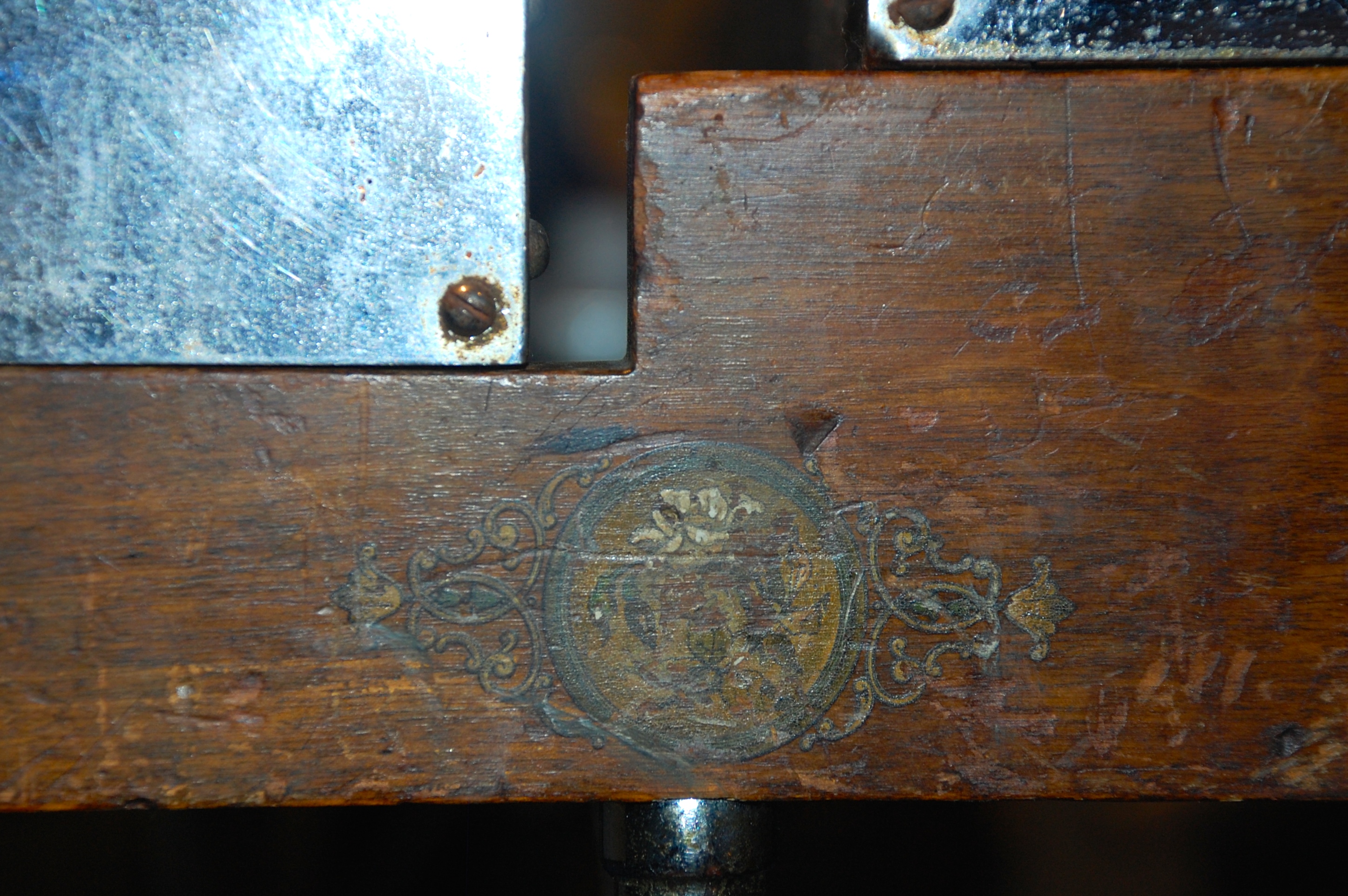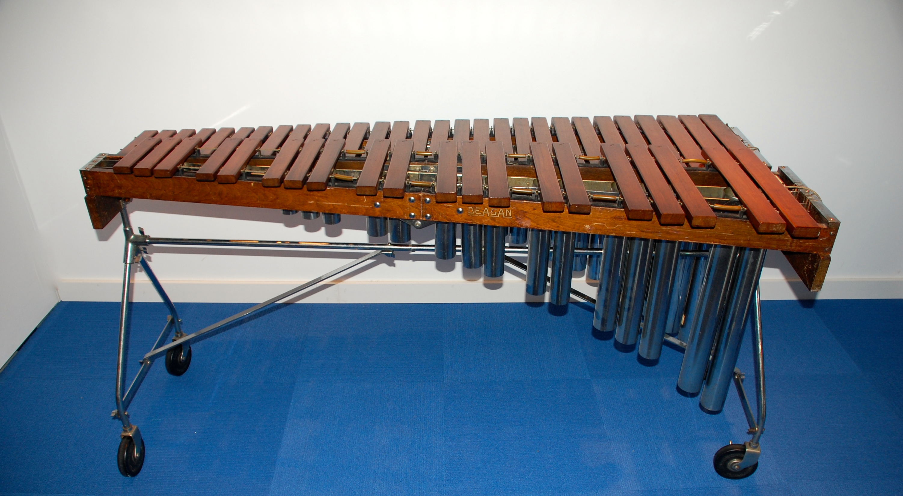 The Marimba pictured below is of no use to modern Marimba Players. The latest compositions require instruments with 5 octaves and this one has only 4. It is however, an example of Marimba manufacturing par excellence. The bars are made of prime rosewood, old heartwood that is simply no longer available and much of the instrument is made of materials that were restricted once the 2nd World War began. The resonating tubes are chrome plated brass, the braces chrome plated steel. The wheels are extra-large and even the Art Nuvo decals are still visible on the wooden end pieces.