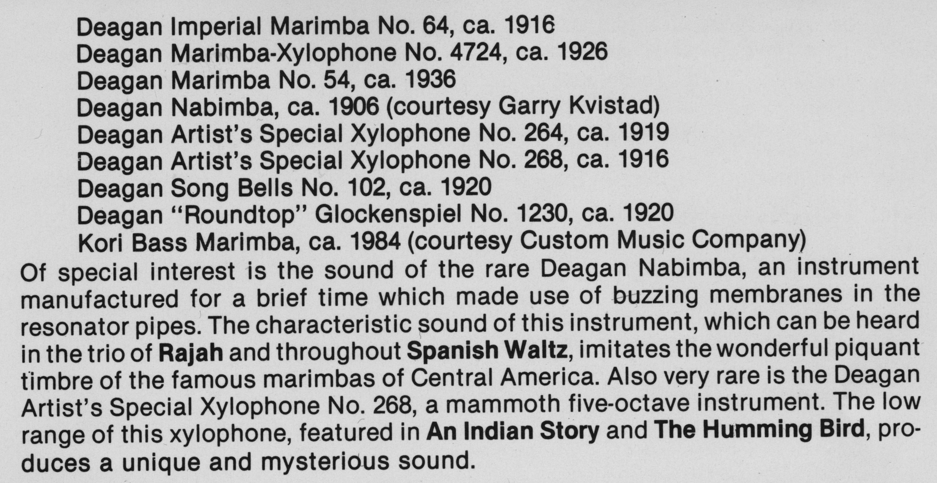 Instruments used on the recording, “Nexus Plays the Novelty Music of George Hamilton Green”. From the CD booklet preparesd by Bob Becker.