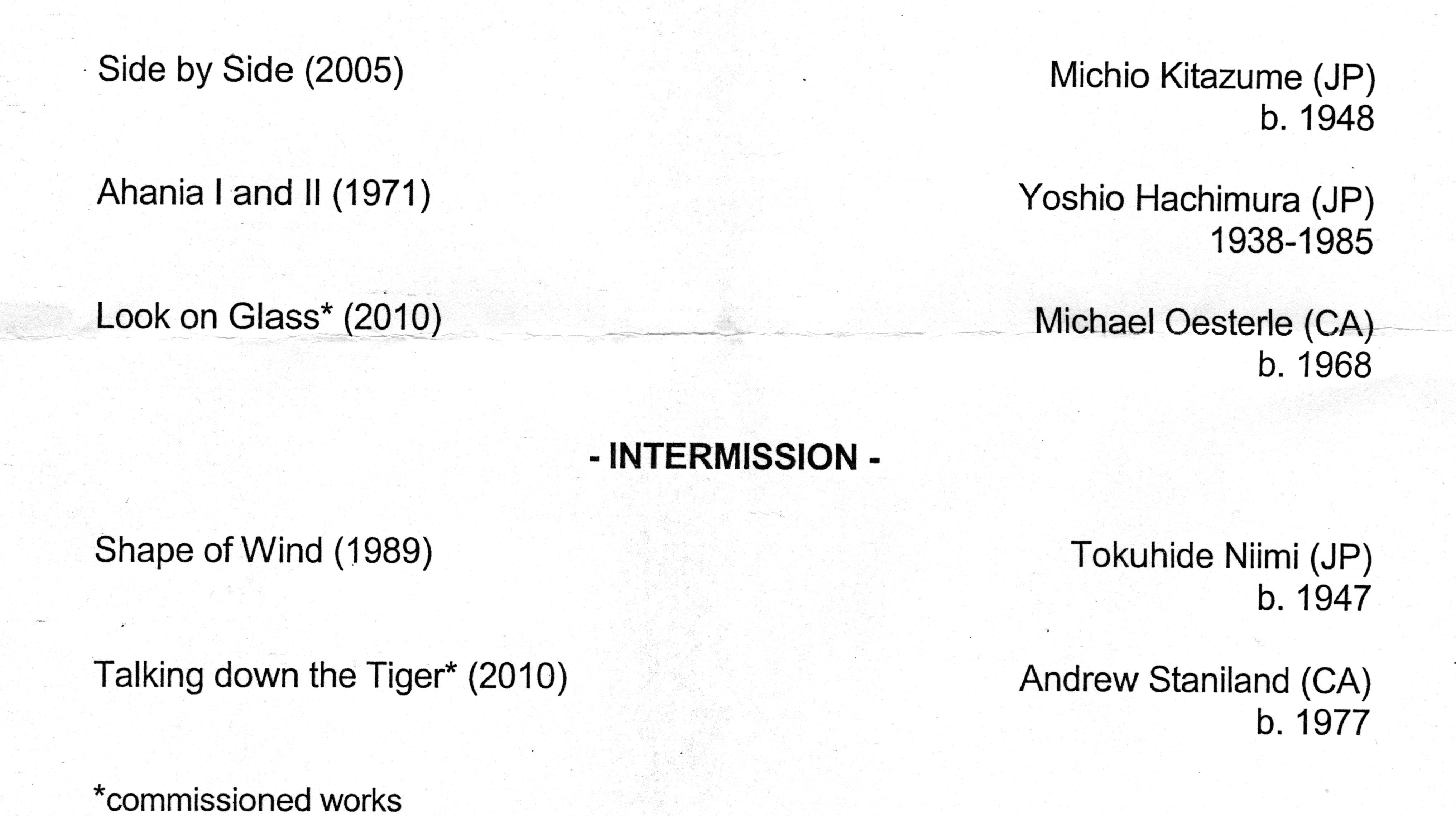 Note: The works on Scott’s program above by Yoshio Hachimura, particularly Ahania II, and Tokuhide Niimi, differed in substantive ways from many American compositions for marimba. They were mesmerizing, rhythmically and harmonically ambiguous and occasionally weightless. Remarkable too were their sudden, surprising silences and absence of expectation. [7.] The latter, best described by John Cage who said of his close friend, “I love Takemitsu’s music because it doesn’t lead me anywhere”.1
