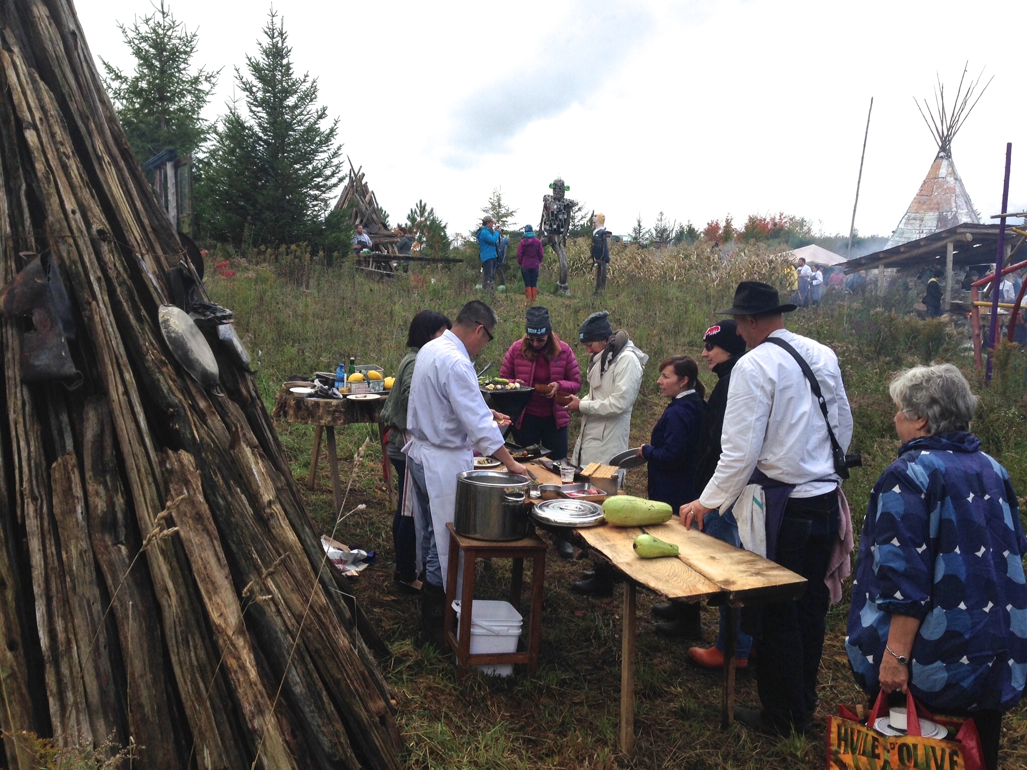 This past Sunday, 5 Ocrober, 2014, my wife and I attended Harvest Feast, a celebratory gathering of chefs and friends in a field on Eigensinn Farm. Michael is involved in environmental issues and led a group who stopped, at least temporarily, the mega quarry which endangered about six area rivers. He espouses the use of locally grown organic products free of hormones and these celebrations, for instance a Wild Leek Festival in early summer honoring the tubor of Shakespearean fame, are attended by large numbers of people who share similar beliefs and enjoy Michael and his wife Nobuyo’s hospitalty.
