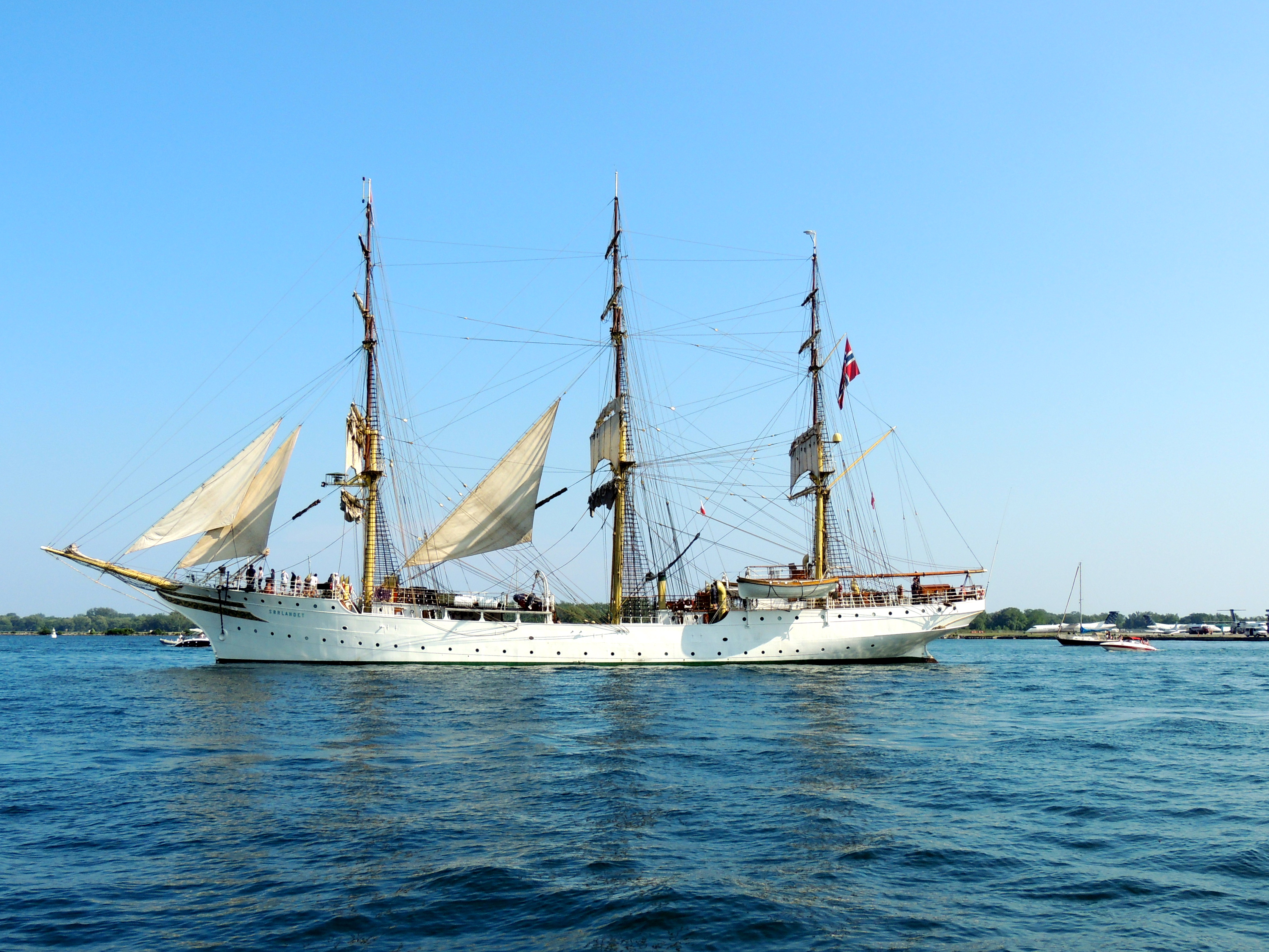 This adventure has been managed by Class Afloat, a Canadian school offering fully accredited education to high school and 1st year university students since 1984.  The ship, pictured above, was built in Norway. For those interested in nautical minutiae, the S.S. SØRLANDET’s length is 64 m, its beam 9 m, its draft 4.5 m and its mast 30.5 m – there are three masts so I don’t know what that means.  Admittedly a bit concerned about our granddaughter’s safety, my wife and I visited the Tall Ships while they were docked in Toronto harbour.