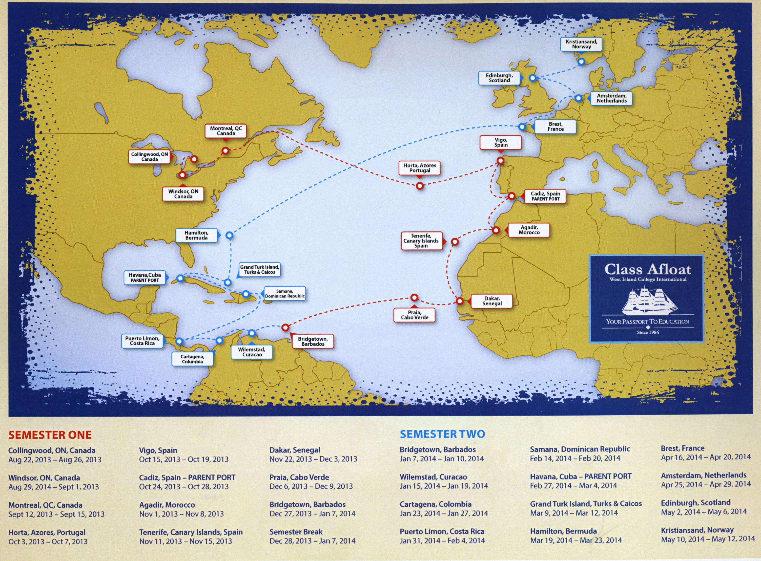 I remember school trips consisting mainly of visits to a local library or museum. When my daughter was about 12 years old, her school class went to Mexico for a week. Now my granddaughter is taking off for 9 months aboard a three masted sailing ship built in 1927 and is crossing the Atlantic Ocean 3 times whilst completing her grade 11 schooling. She and 59 other kids, grade 11 to collegiate freshmen, will have a chef , a professional crew of 12 and a teaching staff of 10.